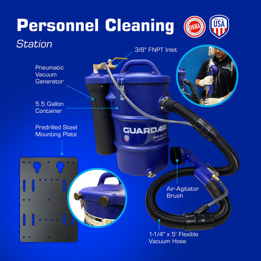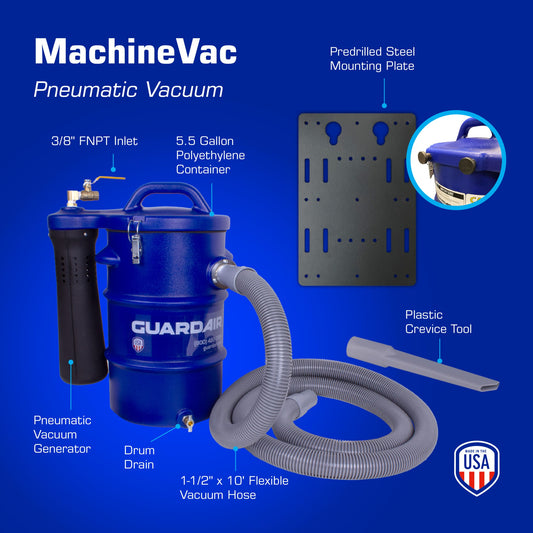 Guardair Pneumatic Vacuums offer significant advantages in performance, dependability, safety, and life-cycle cost over conventional electric-powered vacuums. Powered by compressed air, with no moving parts or electric motors to burn out, these powerful, versatile and low-noise vacuums are ideal for the toughest industrial environments.