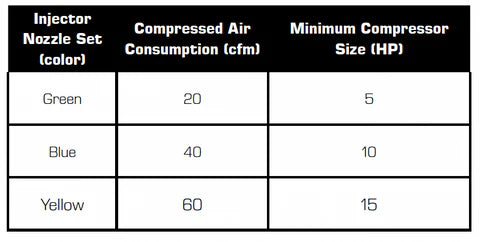 A good rule of thumb states that air compressors generate approximately 4 cubic feet per minute (cfm) of compressed air per horsepower (HP) on a continuous basis. For example, a 50 HP air compressor will generate approximately 200 cfm (4 x 50) on a continuous basis. Refer to the specifications on your air compressor for more information. For a given injector nozzle set, the table above shows the minimum size air compressor required (when run continuously) to supply compressed air to the vacuum.